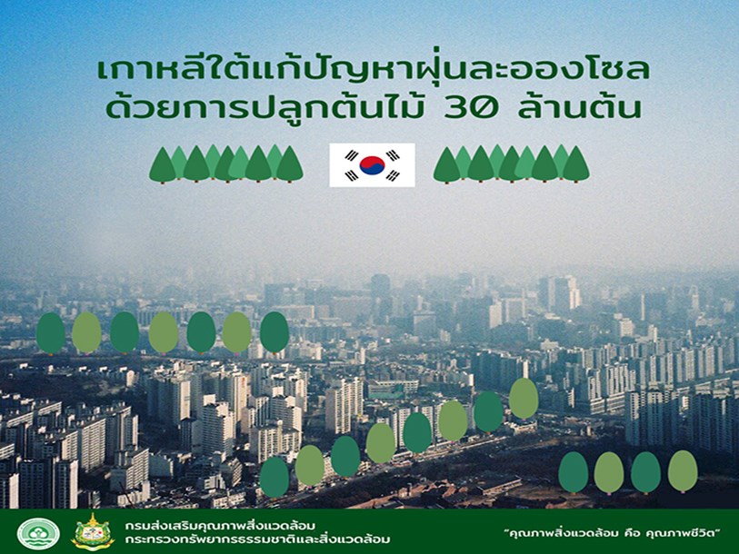 ในช่วงต้นปีที่ผ่านมา ไม่ได้มีแค่ประเทศไทยและเพื่อนบ้านของเราเท่านั้นที่ประสบปัญหา คุณภาพอากาศย่ำแย่ เป็นพิษ อันส่งผลมาจากฝุ่นละอองขนาดเล็ก หรือ PM2.5 เพราะในประเทศเกาหลีใต้ เองก็ประสบปัญหาหนักเช่นเดียวกัน โดยมีสาเหตุหลักมาจากโรงงานอุตสาหกรรมในประเทศจีน และโรงงานที่ ใช้พลังงานถ่านหินภายในเกาหลีใต้เอง รวมถึงการใช้รถยนต์ดีเซล จึงมีการหามาตรการแก้ไขในหลายระดับ ตั้งแต่การปรับความรู้ความเข้าใจเรื่องสิ่งแวดล้อม ให้กับประชาชน และโครงการปลูกต้นไม้ ก็เป็นหนึ่งใน ทางออกระยะยาว