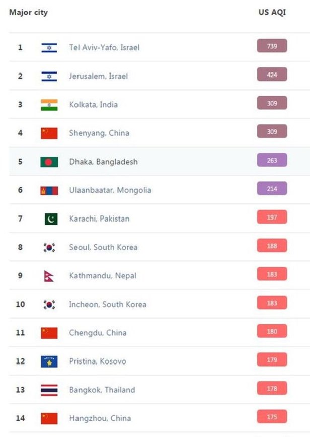 เมื่อวานนี้ เว็บไซต์ แอร์วิชวล (AirVisual) ที่ให้ข้อมูลด้านคุณภาพอากาศทั่วโลก จัดอันดับกรุงเทพมหานคร เป็นเมืองที่มีมลพิษสูงที่สุดอันดับ 9 ของโลก ขณะที่ในวันนี้สถานการณ์ดีขึ้นบ้าง ทำให้อันดับของกรุงเทพฯ เพิ่มเป็นอันดับที่ 13 ด้วยดัชนีคุณภาพอากาศ (AQI) อยู่ที่ 178