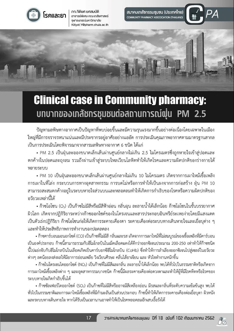 หน้าหลัก >> Knowledge >> PM 2.5 >> จำนวนผู้เข้าชม: 1,484 บทบาทของเภสัชกรรมชุมชนต่อสถานการณ์ฝุ่น PM2.5