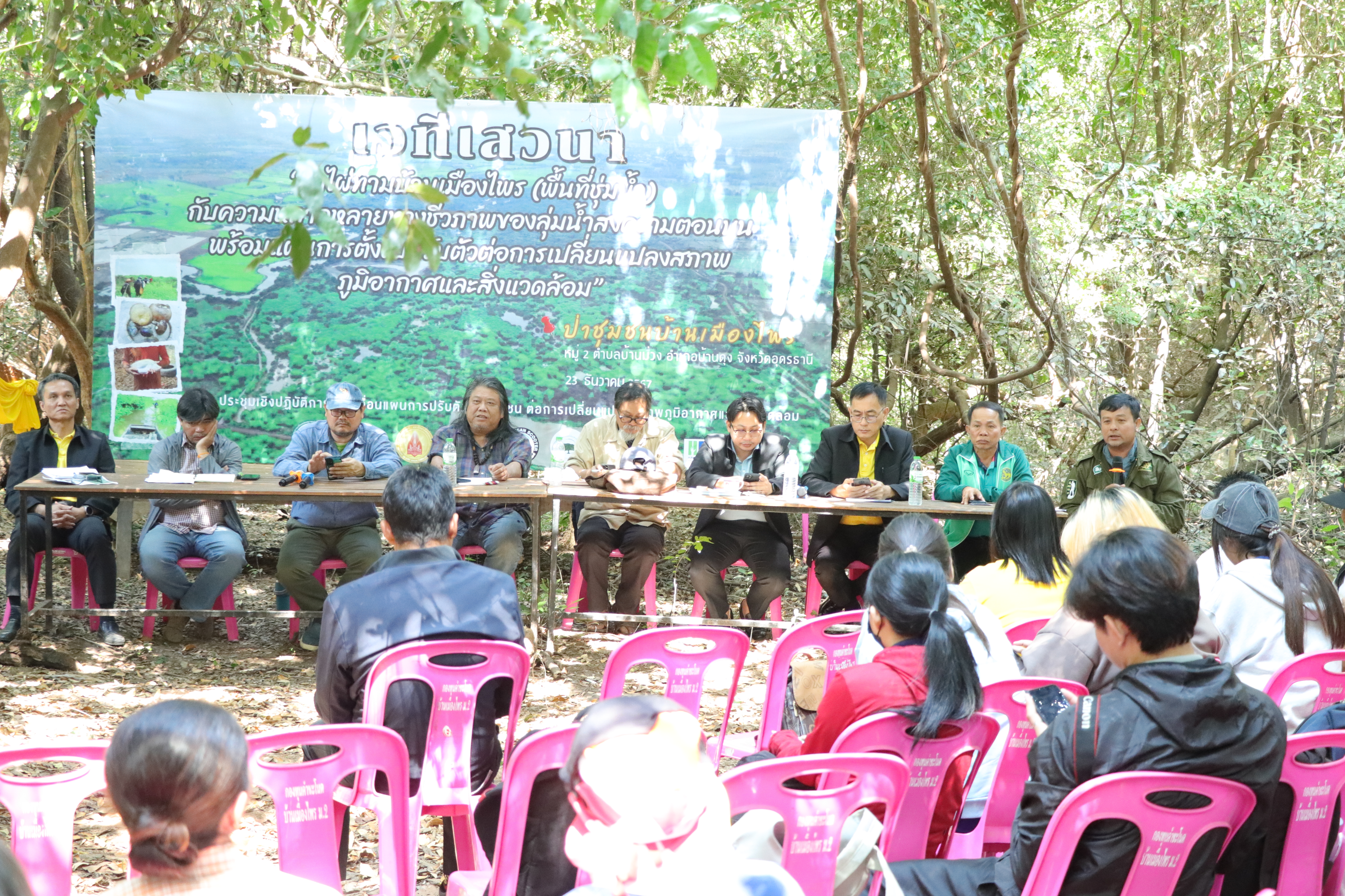 กรมการเปลี่ยนแปลงสภาพภูมิอากาศและสิ่งแวดล้อม ร่วมกับคณะกรรมการป่าชุมชนบ้านเมืองไพร และสมาคมส่งเสริมสิทธิมนุษยชนและสิ่งแวดล้อม จัดประชุมเชิงปฏิบัติการขับเคลื่อนแผนการปรับตัวของชุมชนต่อการเปลี่ยนแปลงสภาพภูมิอากาศและสิ่งแวดล้อม ครั้งที่ 1 ระหว่างวันที่ 22-23 ธันวาคม 2567 ณ ป่าชุมชนบ้านเมืองไพร หมู่ที่ 2 ตำบลบ้านม่วง อำเภอบ้านดุง จังหวัดอุดรธานี เพื่อพัฒนากลไกการมีส่วนร่วม ในพื้นที่ป่า 1,126 ไร่ เพื่อเป็นแหล่งอาหาร แหล่งอนุบาลสัตว์น้ำ และแหล่งกักเก็บน้ำตามธรรมชาติ โดยมีผู้เข้าร่วม 120 คน ทั้งนี้ ได้มีการแลกเปลี่ยนแนวทางการพัฒนากลไกการจัดการน้ำ การผลักดันพื้นที่เพื่อขึ้นทะเบียนเป็นพื้นที่ชุ่มน้ำ การจัดโซนการใช้ประโยชน์ และพื้นที่การเรียนรู้ต่อไป