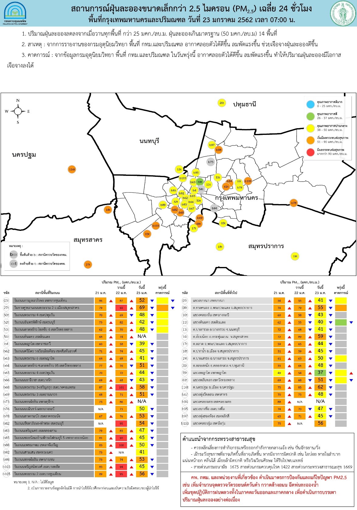 วันนี้ (23 ม.ค. 2562) กรมควบคุมมลพิษ รายงานสถานการณ์ฝุ่นละอองขนาดเล็กไม่เกิน 2.5 ไมครอน หรือ PM 2.5 ประจำวันที่ 23 ม.ค. 2562 จากสภาพอากาศตามพยากรณ์ของอุตุนิยมวิทยาเช้านี้ กรุงเทพฯและปริมณฑล อากาศลอยตัวได้ดีขึ้น ลมพัดแรง ส่งผลทำให้สถานการณ์ PM 2.5 ปริมาณฝุ่นละอองลดลงจากเมื่อวานนี้ (23 ม.ค. 62) ทุกพื้นที่ กว่า 25 มคก./ลบ.ม. ปริมาณฝุ่นละอองเกินค่ามาตรฐาน (50 มคก./ลบ.ม. ) 14 พื้นที่ โดยพื้นที่ริมถนน เกินค่ามาตรฐาน 9 สถานี พื้นที่ทั่วไป เกินค่ามาตรฐาน 5 สถานี คาดว่าสถานการณ์ฝุ่นละอองในวันพรุ่งนี้ (24 ม.ค. 62) อาจทำให้ฝุ่นละอองมีโอกาสเจือจางลงได้