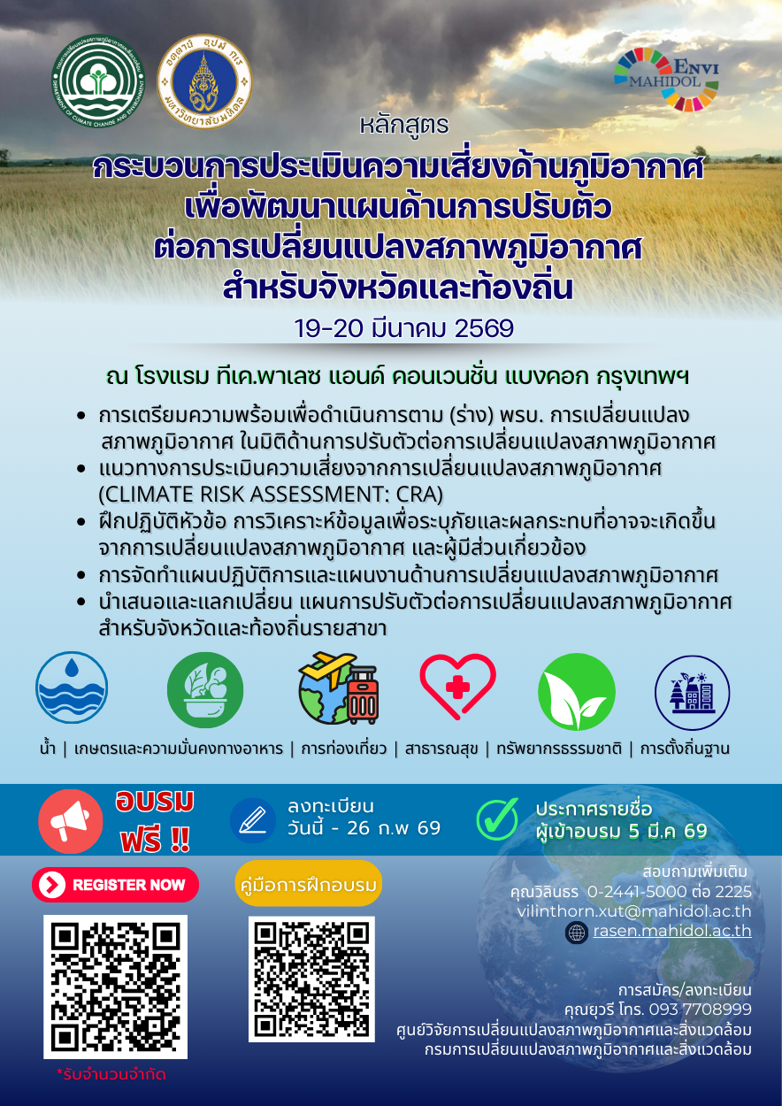 กระบวนการประเมินความเสี่ยงด้านภูมิอากาศเพื่อพัฒนาแผนด้านการปรับตัวต่อการเปลี่ยนแปลงสภาพภูมิอากาศสำหรับจังหวัดและท้องถิ่น (ขอสงวนสิทธิ์พิจารณารับผู้ที่ปฏิบัติงานที่เกี่ยวข้องกับหลักสูตรนี้) |